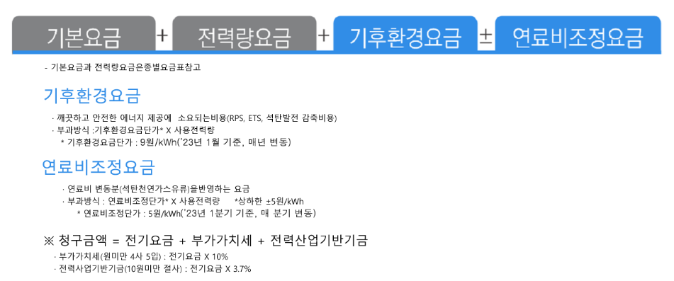 우선 전력 요금은 기본적으로 사용량에 따라 책정이 되지만, 다양한 요금들로 구성이 되어 있습니다